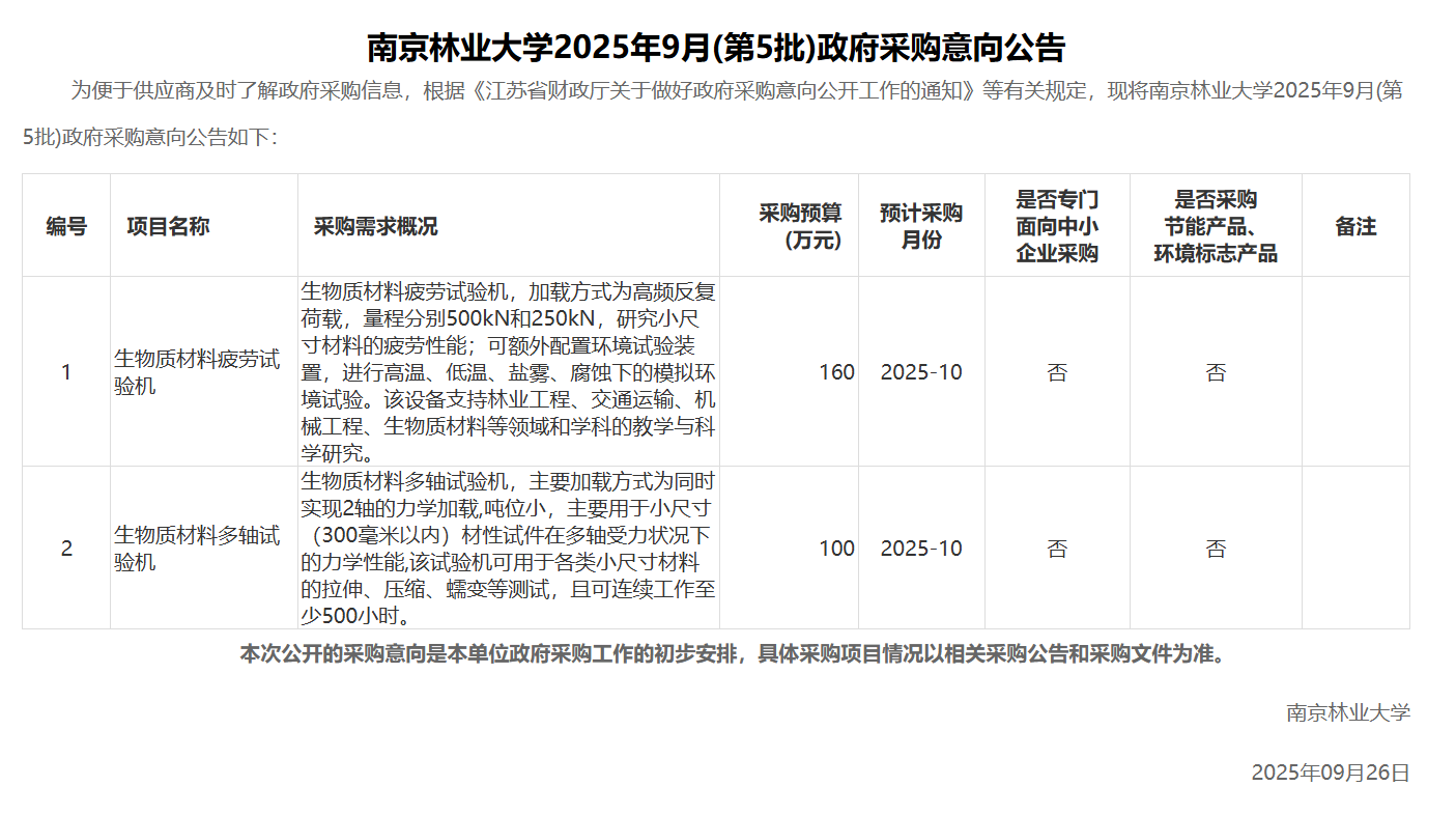 南京林业大学2025年9月(第5批)政府采购意向公告