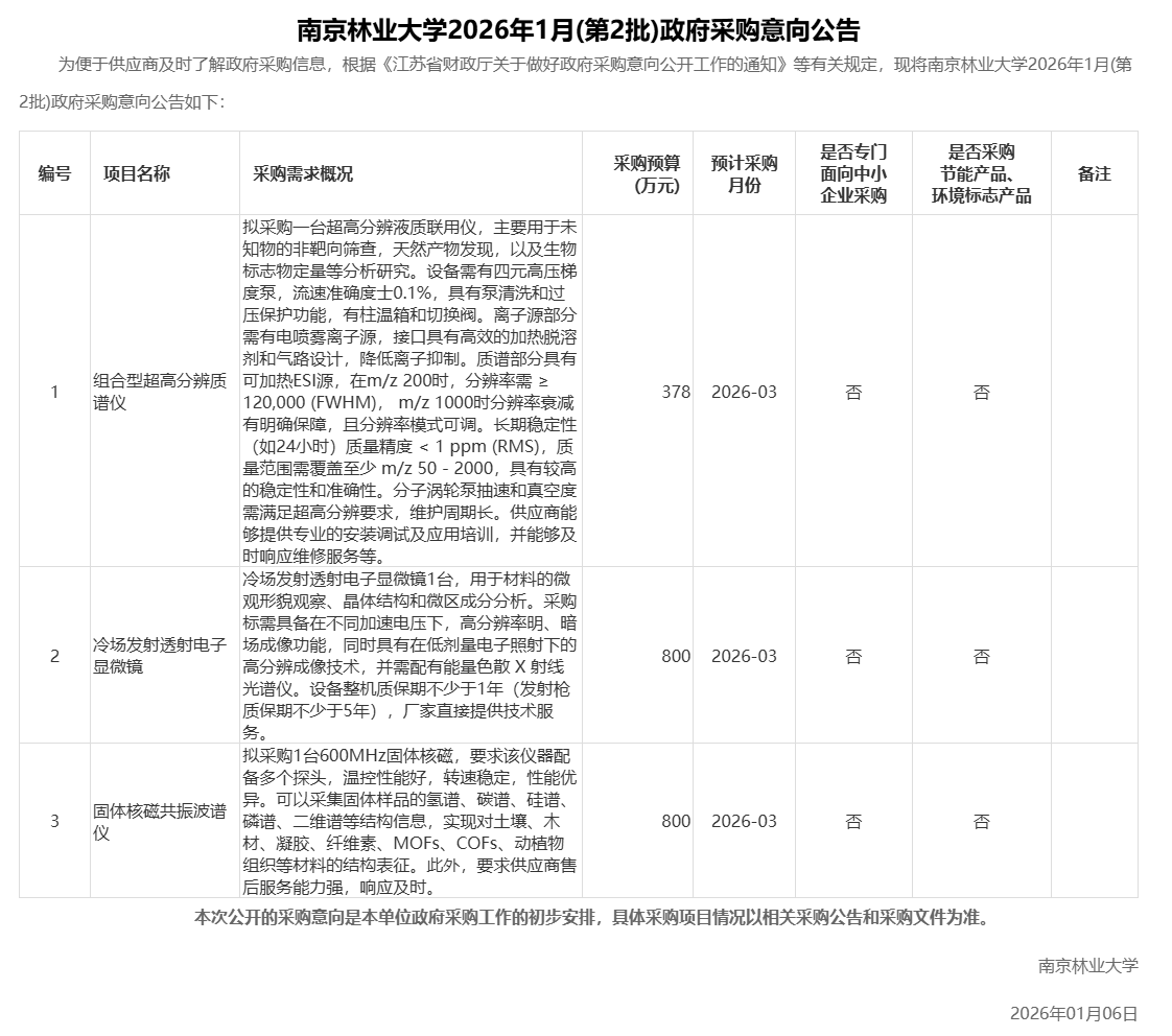 南京林业大学2026年1月(第2批)政府采购意向公告