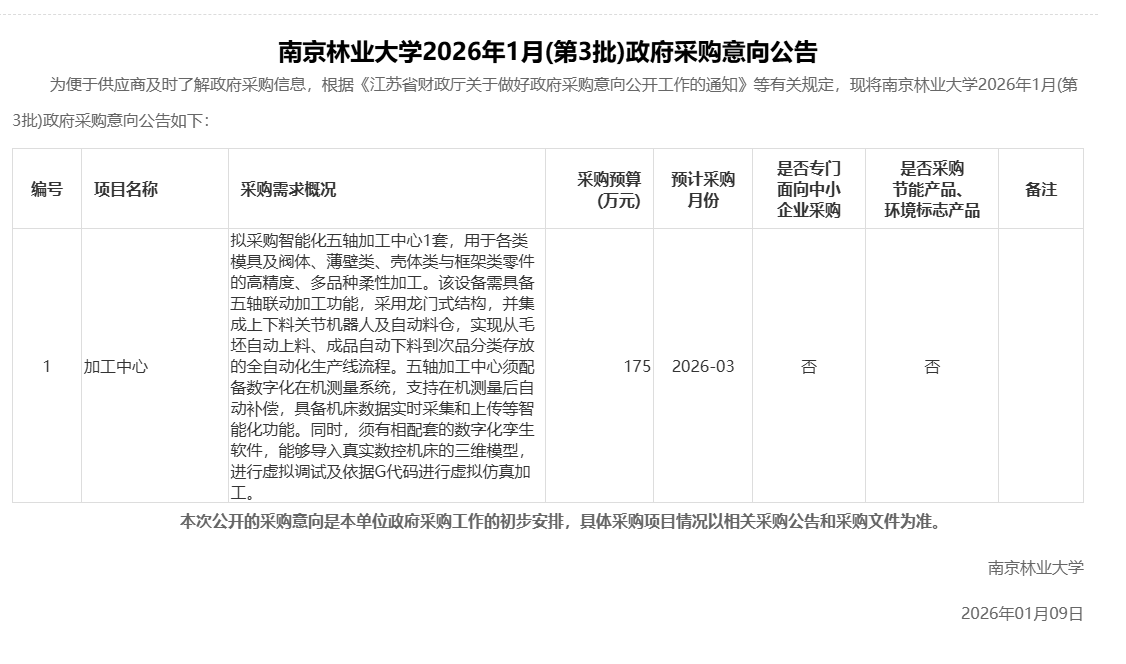南京林业大学2026年1月(第3批)政府采购意向公告