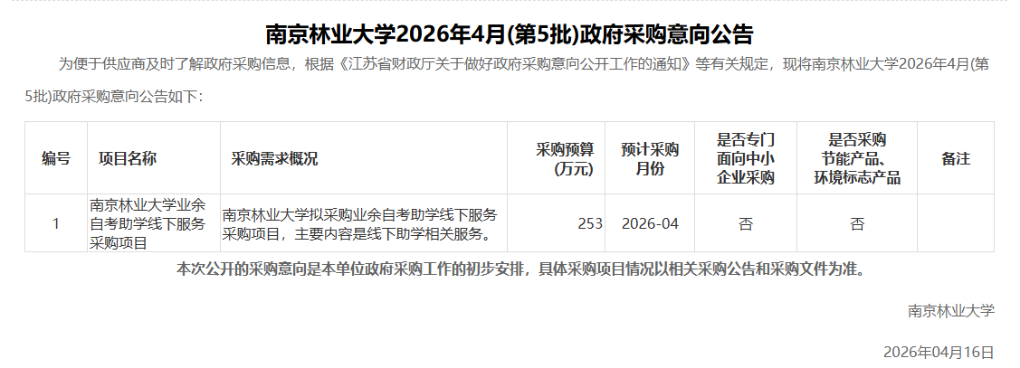 南京林业大学2026年4月(第5批)政府采购意向公告